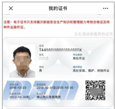 查询证件真伪,可在“国家安全生产考试”公众号【查询证件】,点击【证件扫码查询】,对准电子证上的二维码,若跳转至特种作业操作证界面,即为真实证件。