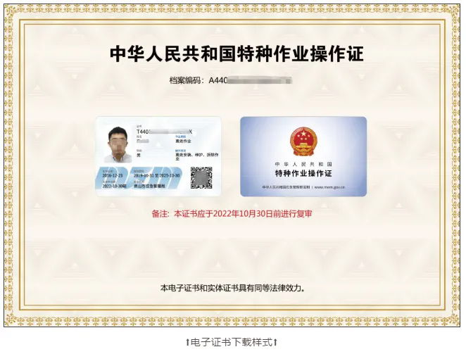 持证人在微信端注册并进行实人认证后,可获取特种作业证对应证书;电子证书和实体证书具有同等法律效力。企业或执法人员可通过公众号扫码以辨别二维码的真伪。